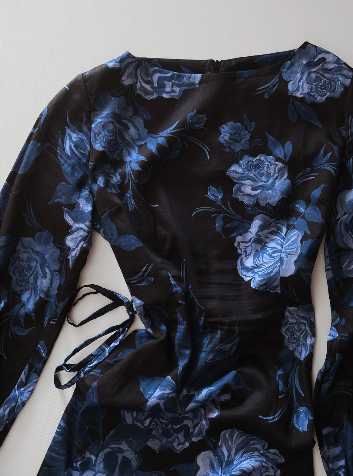 The Midnight Dress channels ’70s energy with its boat neckline, bell sleeves, and mini length, brought to life by dreamy blue florals on a black base. Crafted from soft, delicate cotton with a subtle sheen, this piece blends comfort and modern femininity , designed to move effortlessly from day to night.