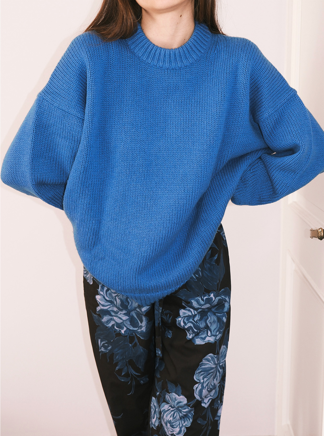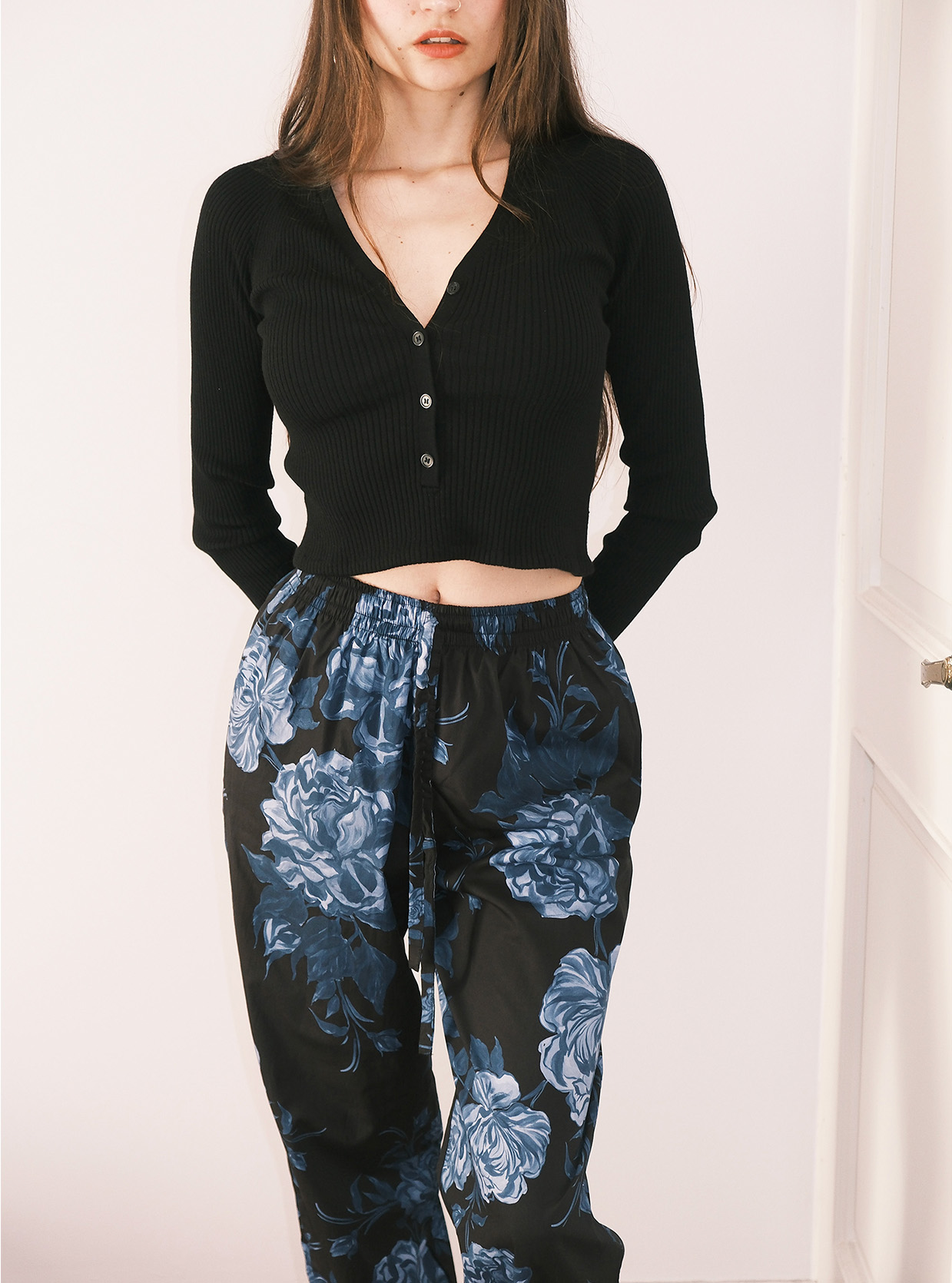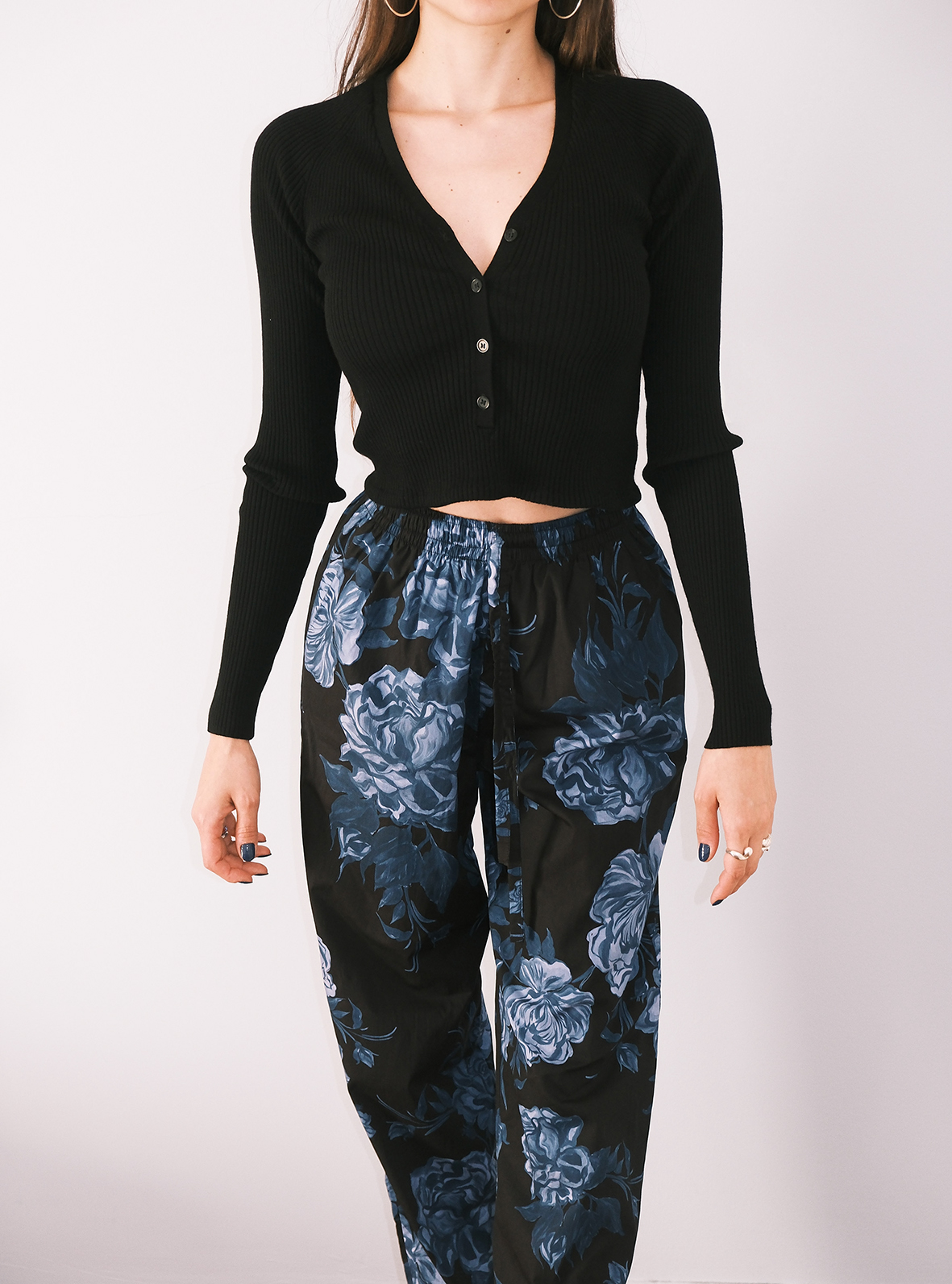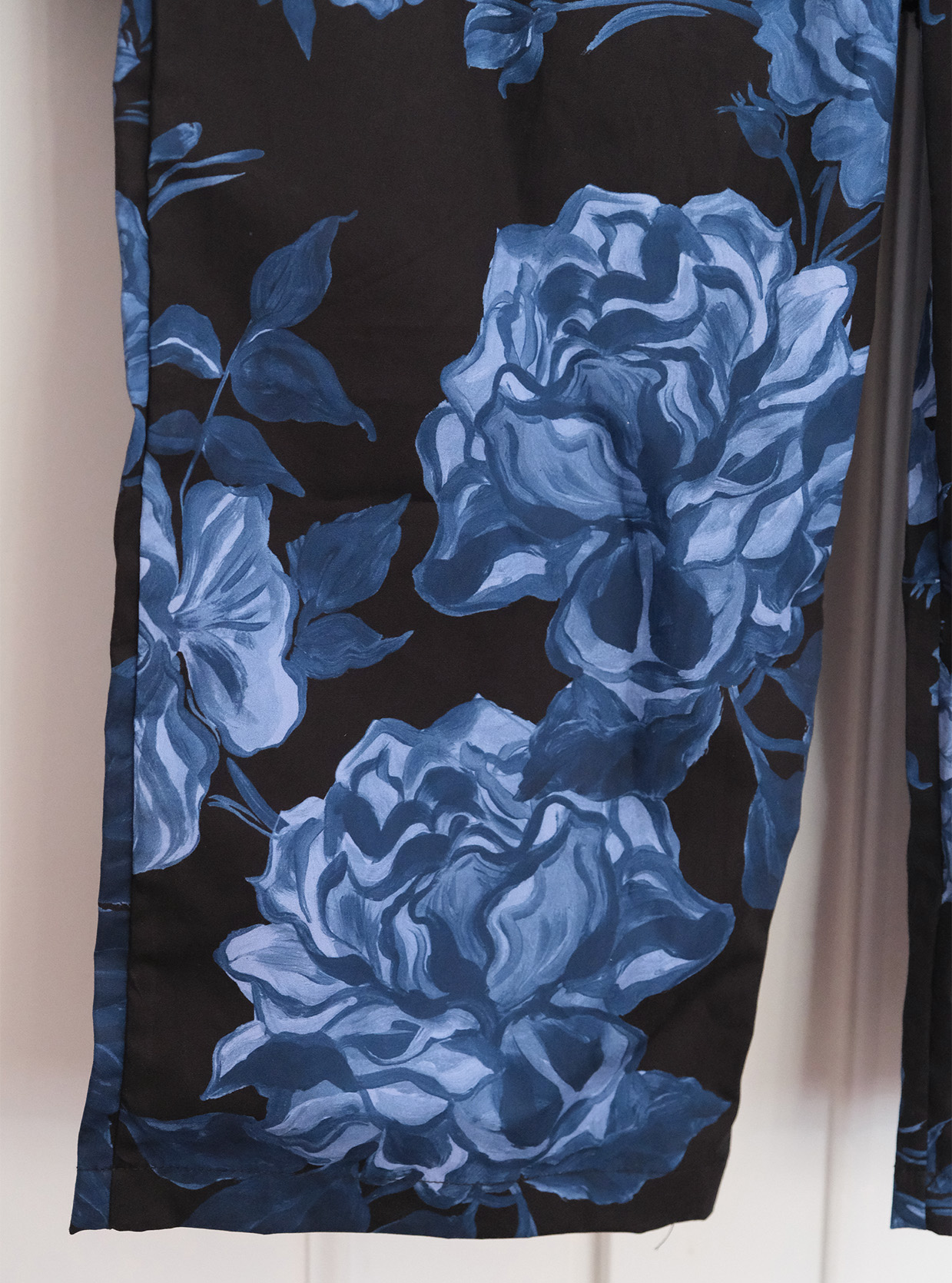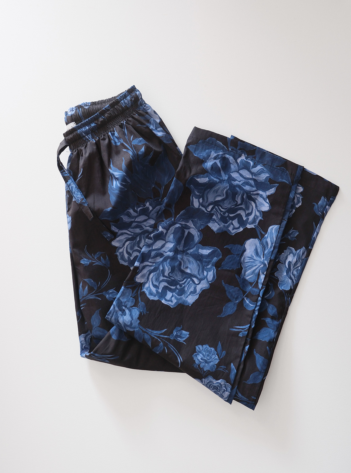 The Midnight Pants deliver pyjama-level comfort with runway-ready style. Crafted from 100% cotton poplin, they feature a soft, lightweight feel and a striking blue floral print set against a deep black base.