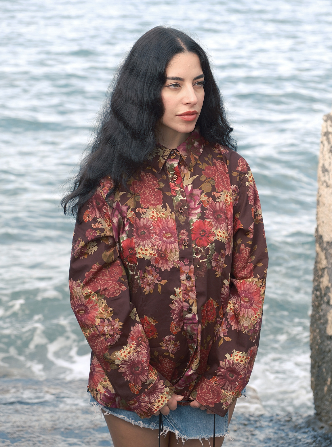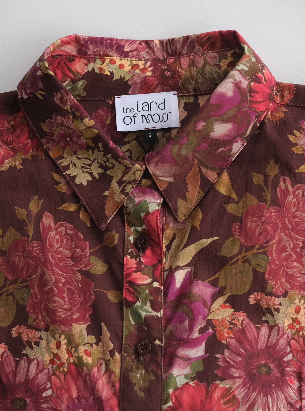 Step back into the ’70s with the Nostalgic Garden Shirt, a burgundy – brown cotton poplin button up featuring watercolor florals in a warm, retro palette. Perfect for daydreamers and night explorers .Dress it down with jeans or elevate it for a night out.
